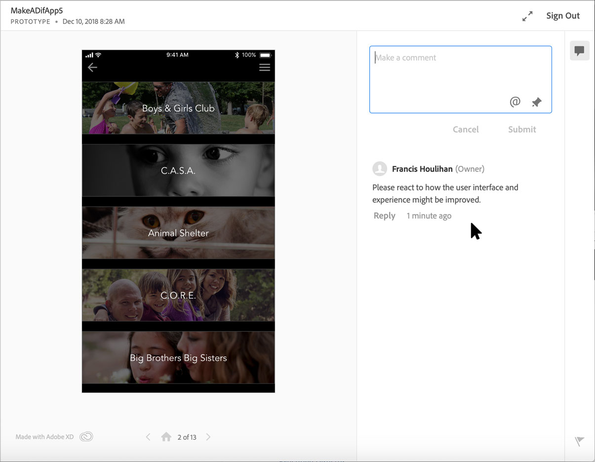 By publishing a link collaborators can do a "focus group" interaction to test the user experience of their app design. Collaboration Focus Group. After testing the interface and logging in to the Creative Cloud they can leave comments and reply to others insights / recommendations.